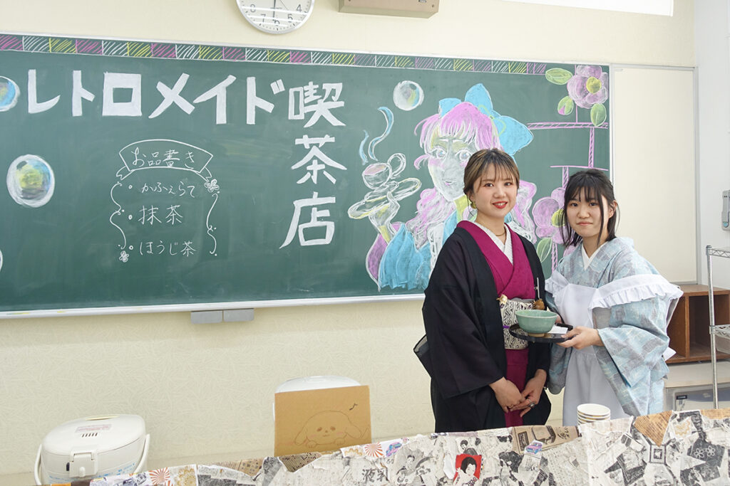 『レトロメイド喫茶』ではかわいいエプロンをした学生たちが抹茶をたててくれました。