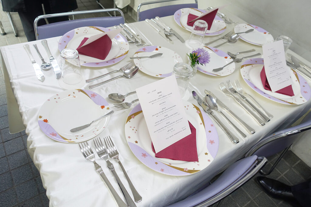 今回、西洋料理はレストラン形式で、学生が日ごろ学んだ料飲サービスでお客様をおもてなししました。