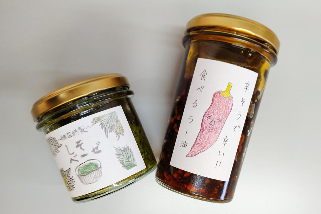 織田特製の「辣油」と「しそベーゼ」はパッケージのイラストもポイント!